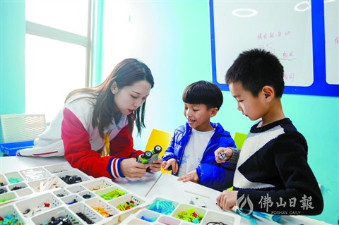 禪城區(qū)小小世界國際早教中心內(nèi),小朋友正在上樂高課。/佛山日報記者符詩賀攝