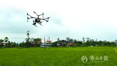 佛山市高明區(qū)凌霄農(nóng)業(yè)科技有限責(zé)任公司的無(wú)人機(jī)正在田間工作。/企業(yè)供圖