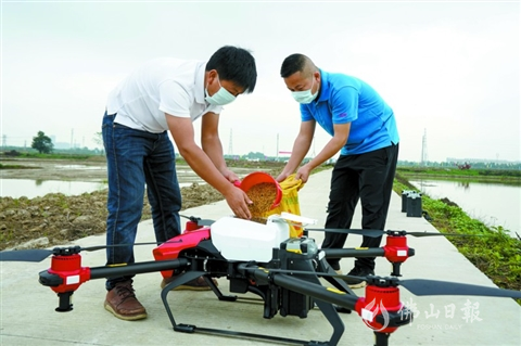 工作人員正在為農(nóng)用無人機(jī)裝載水稻種子。該農(nóng)用無人機(jī)最多可裝載12斤水稻種子,一塊電池續(xù)航能力為15分鐘。/佛山日報記者 賴基潤攝