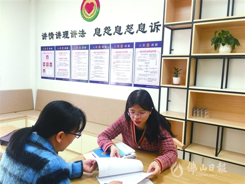 何倩雯(右)到人民調(diào)解組織指導(dǎo)規(guī)范化建設(shè)。/受訪者供圖