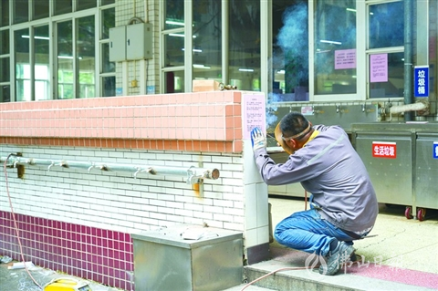 工人在華僑中學(xué)食堂加裝水龍頭,方便學(xué)生飯前飯后洗手。/佛山日報(bào)記者官文婷攝