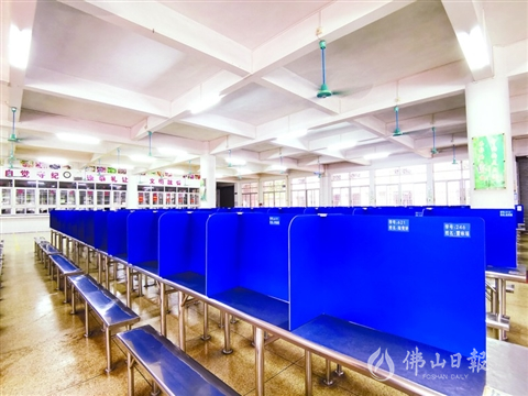 三水中學(xué)的食堂餐桌已加裝隔板并貼上學(xué)生的名字和學(xué)號。/佛山日報(bào)記者何艷純攝