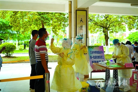 昨日,三水中學(xué)附屬初中首批返崗教職工接受核酸檢測。/佛山日報(bào)記者官文婷攝