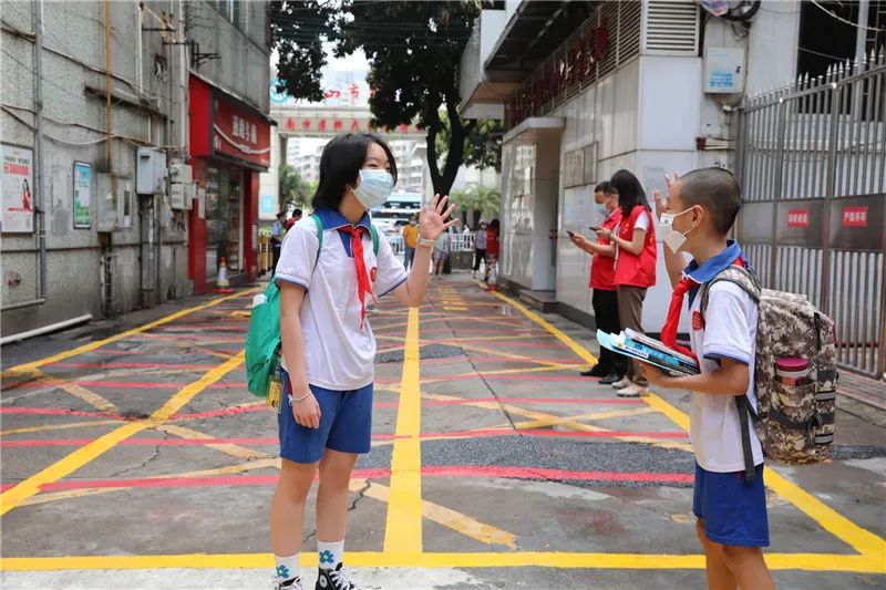 鐵軍小學(xué)學(xué)生與許久不見(jiàn)的同學(xué)打招呼。(文圖/佛山日?qǐng)?bào)記者 符詩(shī)賀)佛山九小門(mén)口,同學(xué)們互相問(wèn)好。(文圖/佛山日?qǐng)?bào)記者 符詩(shī)賀)“來(lái),看看比老師高多少!”在佛山市城南小學(xué)校門(mén)口,一名學(xué)生和老師在比身高。老師說(shuō),疫情宅家期間,許多同學(xué)都長(zhǎng)高了。(文圖/佛山日?qǐng)?bào)記者 林舒)佛山市城南小學(xué),一名學(xué)生在假期不小心受傷了,今天只能拄著拐杖返校。老師遠(yuǎn)遠(yuǎn)見(jiàn)到,趕緊上前攙扶。家長(zhǎng)表示,已提醒小孩少走動(dòng),體育課時(shí)在課室休息。老師亦表示,會(huì)重點(diǎn)關(guān)注該學(xué)生的安全,請(qǐng)家長(zhǎng)放心。(文圖/佛山日?qǐng)?bào)記者 林舒)同濟(jì)小學(xué)為孩子們準(zhǔn)備了寓意平安吉祥的大蘋(píng)果和一張“健康歸來(lái),從心開(kāi)始”的卡片。(文圖/佛山日?qǐng)?bào)記者 鄒婷婷)