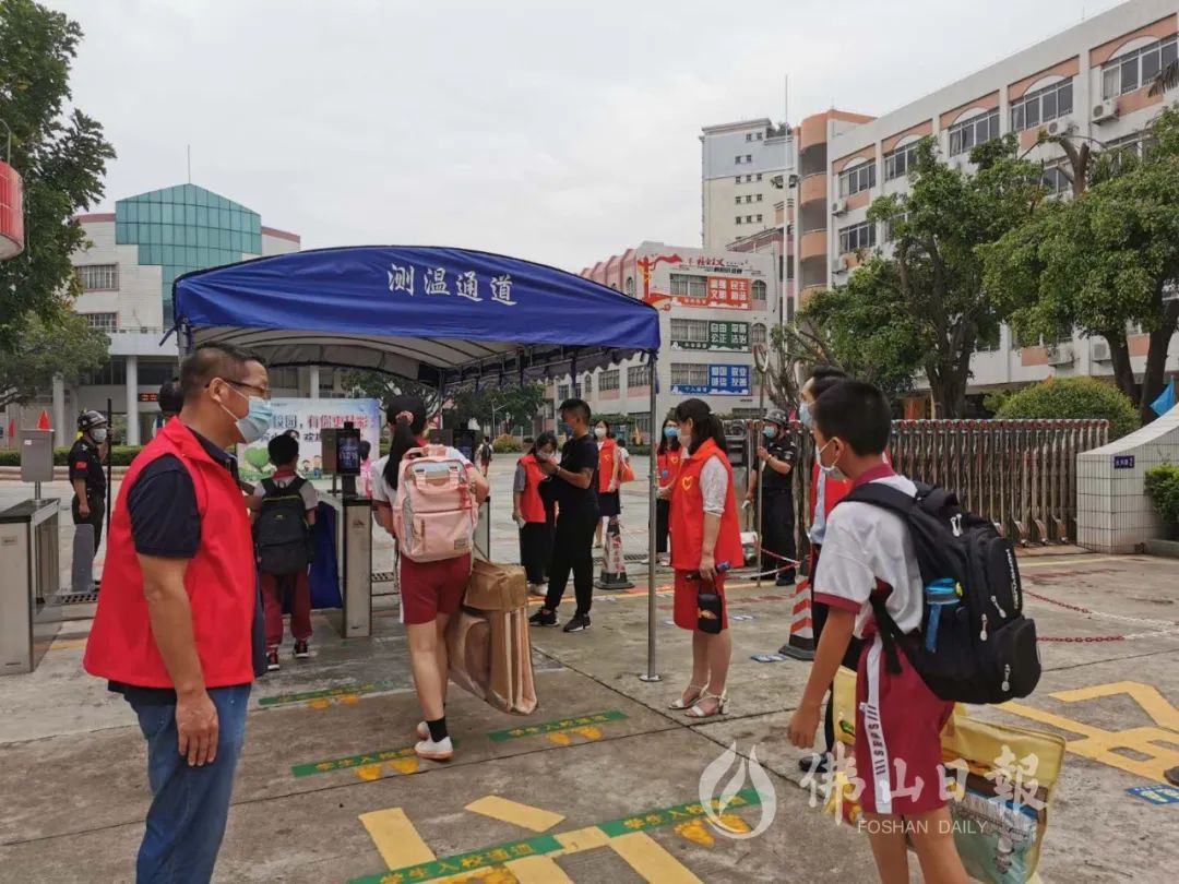 桂江小學(xué)門(mén)口,家長(zhǎng)剛將“神獸”送進(jìn)學(xué)校,就忍不住在學(xué)校圍欄處看多一會(huì)自己的孩子。(文圖/佛山日?qǐng)?bào)記者 王偉楠)7時(shí),鐵軍小學(xué)學(xué)生排隊(duì)間隔一米有序進(jìn)入校園。(文圖/佛山日?qǐng)?bào)記者 符詩(shī)賀)“早上好!”從7時(shí)30分起,佛山市城南小學(xué)迎接學(xué)生返校。(文圖/佛山日?qǐng)?bào)記者 林舒)南海區(qū)燈湖小學(xué)設(shè)置三個(gè)門(mén)口讓學(xué)生進(jìn)校,有效分流減少聚集。(文圖/佛山日?qǐng)?bào)記者 王偉楠)九江鎮(zhèn)海壽小學(xué)的孩子們?cè)诜鹕胶J戮?、九江?zhèn)教育局、九江鎮(zhèn)派出所、九江社區(qū)衛(wèi)生服務(wù)中心等各單位相關(guān)人員及海壽村黨員志愿隊(duì)、學(xué)校老師們的引領(lǐng)護(hù)航下,平安返校?。ㄎ?佛山日?qǐng)?bào)記者 黎俏婷)7時(shí)20分起,位于大良街道近良文暉路38號(hào)的大良世紀(jì)小學(xué)門(mén)口開(kāi)始忙碌起來(lái),五六年級(jí)的學(xué)生們,經(jīng)過(guò)信息登記、亮碼、測(cè)溫、消毒等重重關(guān)卡進(jìn)入校園。(圖/佛山日?qǐng)?bào)記者 郭東霓)