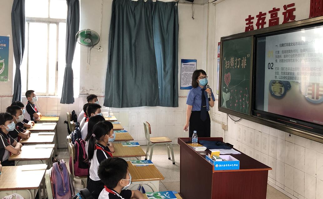 由于疫情原因,“第一課”選取了梁季彝紀念學(xué)校五六年級當(dāng)中一個班級進行現(xiàn)場講授,其余班級采取校園廣播等方式學(xué)習(xí)。在現(xiàn)場,蓬桂梅將“掃黃打非”與未成年人思想道德建設(shè)緊密結(jié)合,講解了如何學(xué)會甄別正確的出版物、篩選網(wǎng)絡(luò)信息等方面的知識,提醒學(xué)生要以積極向上的心態(tài)投身新學(xué)期的學(xué)習(xí)。