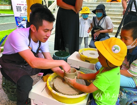 師從南山五彩陶釉非遺傳承人的錢勇全在教小朋友制作陶藝作品。/佛山日報記者楊立韻攝