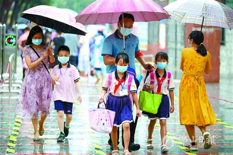 5月25日上午,高明沛明實(shí)驗(yàn)小學(xué)的老師們?yōu)閷W(xué)生撐起了愛心傘,護(hù)送他們走進(jìn)校園。