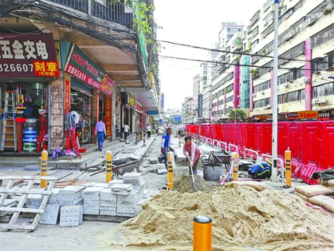 近日,工人在榴苑路重新鋪設地磚。/佛山日報記者馮棟攝