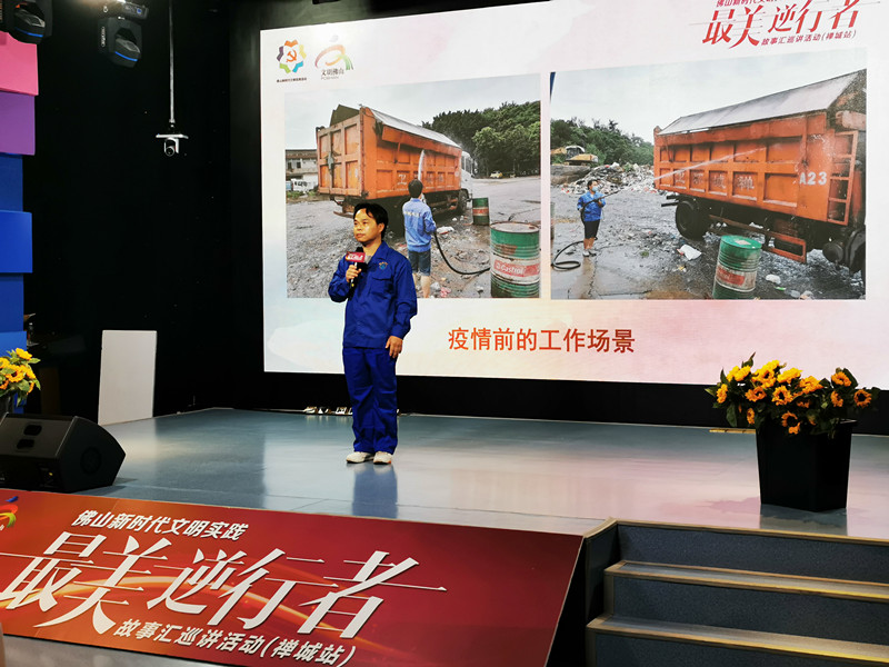 禪城區(qū)環(huán)境衛(wèi)生養(yǎng)護中心環(huán)衛(wèi)工人譚文濱分享戰(zhàn)“疫”故事。/佛山市文明辦供圖