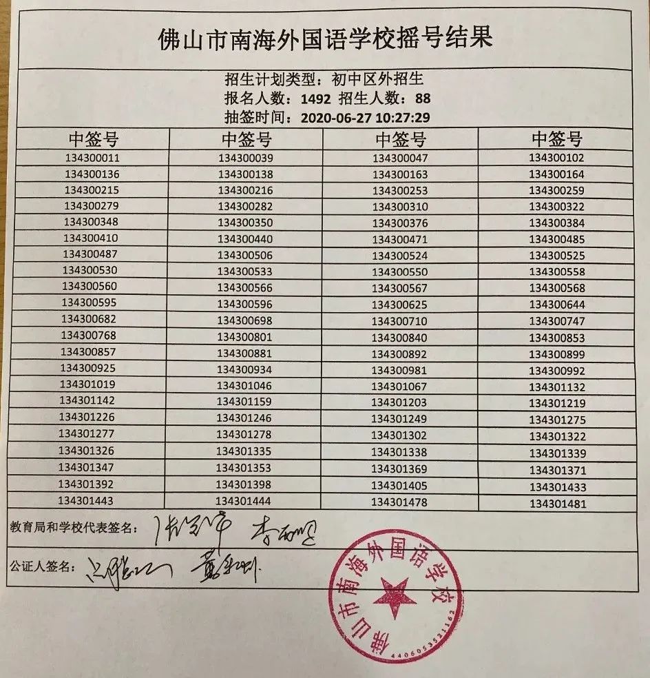 初中部區(qū)外計劃搖號錄取中簽號為: