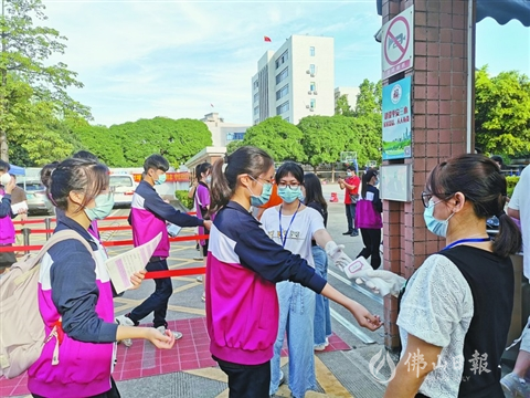昨日上午,北外附校三水外國語學(xué)校考生經(jīng)測溫、手部消毒后進(jìn)入三水區(qū)華僑中學(xué)考點(diǎn)。/佛山日報(bào)記者何艷純攝
