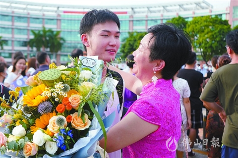昨日,在三水中學(xué)考點(diǎn)外,家長與考生懷抱鮮花激動(dòng)相擁。/佛山日報(bào)記者賴基潤攝
