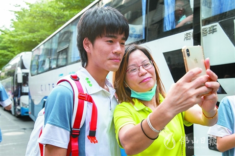 昨日,在佛山二中考點(diǎn)外,考生與親人自拍留念。/佛山日報(bào)記者符詩賀攝