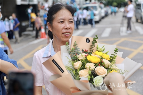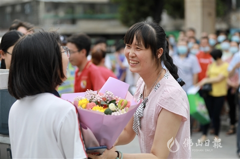 高明一中考場外,一名家長為剛剛完成高考的孩子送花。