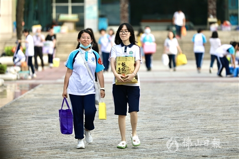 高明一中考生提著復(fù)習(xí)資料,高興地走出校門。