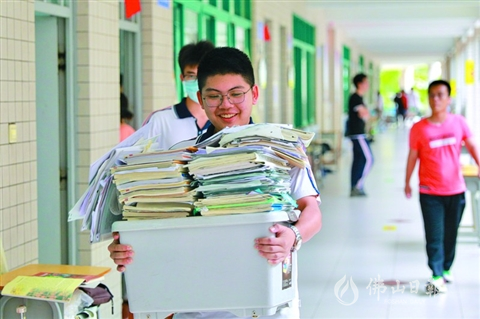 昨日,高考結(jié)束后,高明一中考生搬著復(fù)習(xí)資料走出校門。/佛山日報記者呂潤致攝