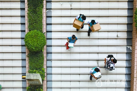 志愿者為高三學(xué)長學(xué)姐搬運行李