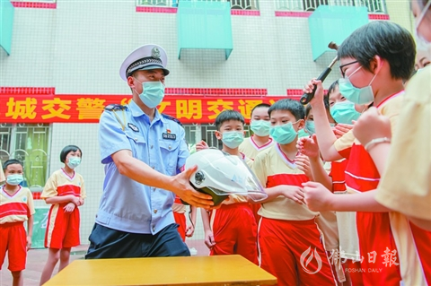 5月27日,禪城公安走進(jìn)同濟(jì)小學(xué)開(kāi)展“一盔一帶”交通安全第一課,民警朱沛霖通過(guò)“敲西瓜”測(cè)試普及交通安全知識(shí)。/佛山日?qǐng)?bào)記者王澍攝