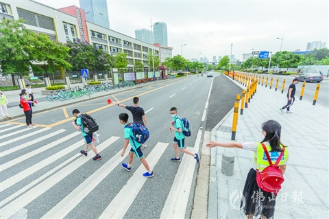 佛山市多部門(mén)聯(lián)合提升學(xué)校周邊交通安全設(shè)施,成效顯著,圖為燈湖小學(xué)周邊交通設(shè)施進(jìn)行了大幅提升改造,拓寬了道路,設(shè)置了接送車(chē)道。/佛山日?qǐng)?bào)記者王偉楠攝