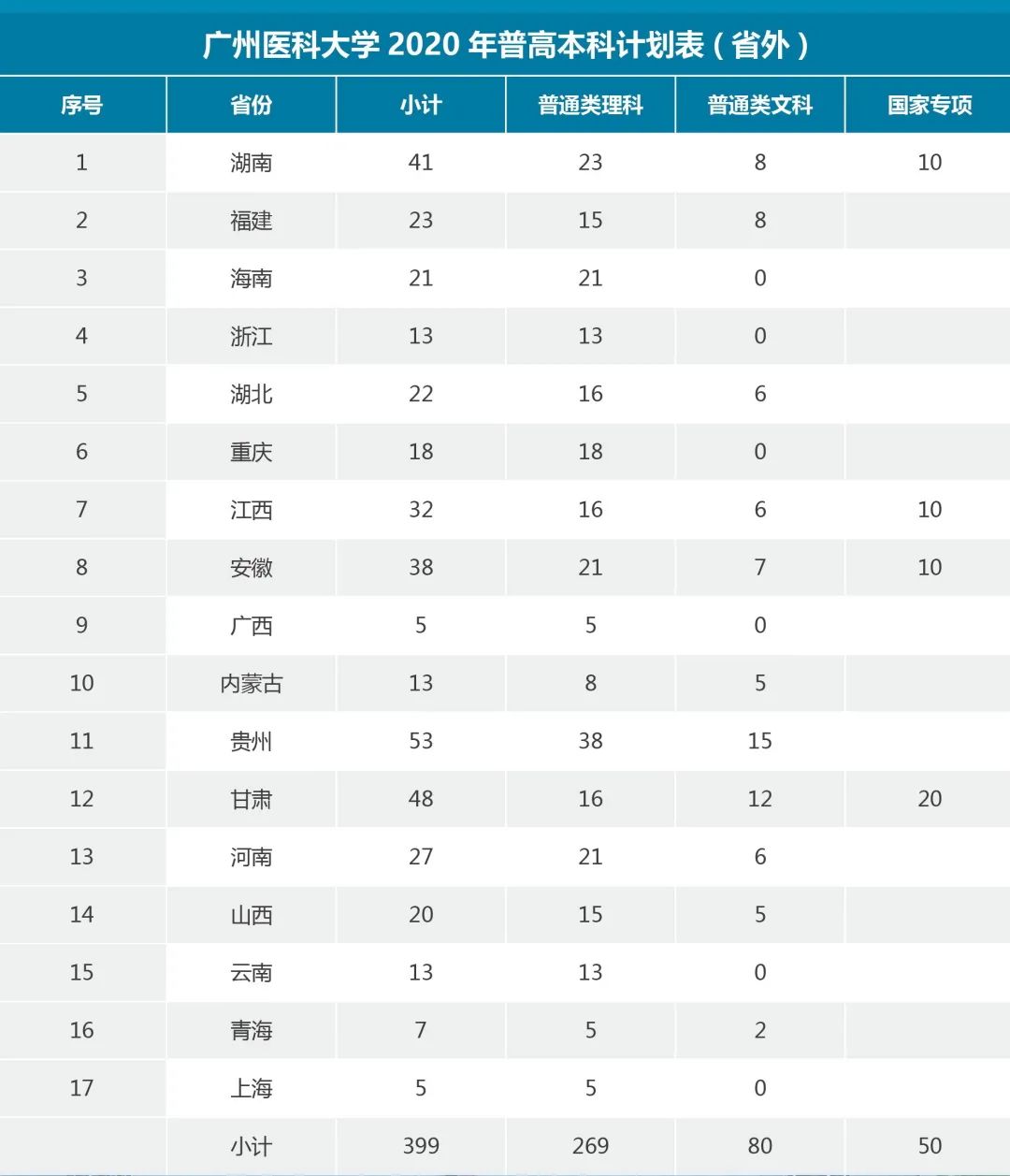 廣州醫(yī)科大學(xué)2020年普高本科計(jì)劃表(省外)