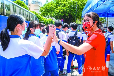 進考場前,佛山十中老師與考生們擊掌鼓勁。/佛山日報記者符詩賀攝