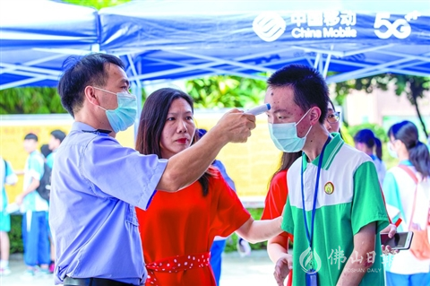 在第三中學初中部考場,入場考生均要 進行體溫檢測。/佛山日報記者符詩賀攝