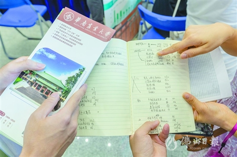 一家長(zhǎng)在筆記本里摘錄了各學(xué)校的招生亮點(diǎn)。