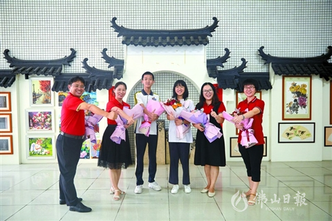 8月5日,滄江中學(xué)考生李銘軒(左三)、黎宇菲(左四)與老師合影。/佛山日報記者呂潤致攝