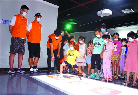 大學(xué)生義工團(tuán)的志愿者帶領(lǐng)學(xué)員們體驗高科技互動答題。/佛山日報記者譚兼之?dāng)z
