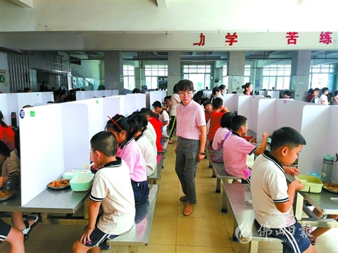 德信實(shí)驗(yàn)學(xué)校生活老師監(jiān)督就餐學(xué)生節(jié)約糧食。/學(xué)校供圖