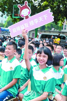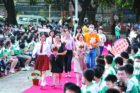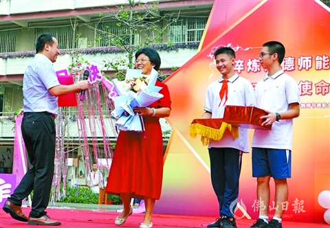 昨日上午,佛山三中初中部校園里,一條從籃球場(chǎng)延伸到領(lǐng)獎(jiǎng)臺(tái)的紅毯格外引人注目。在主持人的逐一介紹下,該校老師手拿鮮花陸續(xù)走上紅毯。兩旁是學(xué)生和家長(zhǎng)們的歡呼。“亞洲初戀續(xù)永紅”“數(shù)學(xué)顏霸郭常靜”“天才愛(ài)豆陳云英”…… 除了掌聲和喝彩之外,許多班級(jí)還定制各種應(yīng)援牌,向自己喜愛(ài)的老師花式“告白”。