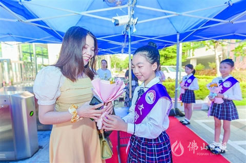 環(huán)湖小學(xué)學(xué)生為老師送上鮮花。/佛山日?qǐng)?bào)記者王偉楠攝