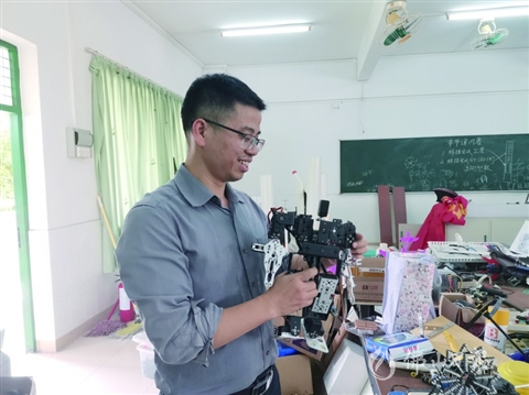 走進三水中學物理老師沈艷文的工作室,各種零件、設備堆得滿地都是,幾乎沒有落腳的地方。但哪怕只是一顆小小的螺絲釘,他都能準確找到它的位置。有些科技作品做好后又被拆開,零件被反復使用,不斷創(chuàng)造價值,這也跟他的教學理念相連:在日復一日的教學中,發(fā)現(xiàn)新的東西。