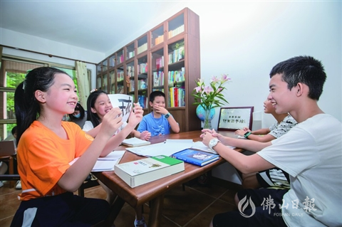 在湖景路一家書香樂園鄰里圖書館,小讀者們在分享讀書心得。(資料圖片)/佛山日報記者王澍 實習生何明勇攝