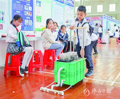 12月12日,第36屆佛山青少年科技創(chuàng)新大賽現(xiàn)場,順德龍江城區(qū)中心小學(xué)學(xué)生展示創(chuàng)新作品“球場積水清除小車”。/佛山日報記者呂潤致攝