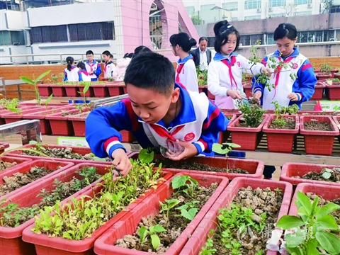 在佛山九小的農(nóng)耕親子農(nóng)場里,學(xué)生細(xì)心打理農(nóng)作物。/學(xué)校供圖