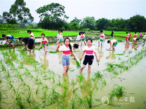 禪城區(qū)同濟(jì)小學(xué)的師生們則走出校園。4月11日,學(xué)校組織師生到羅定市羅平鎮(zhèn),與當(dāng)?shù)剞r(nóng)民一起插秧、耕地。同學(xué)們光著腳丫、卷起褲腳,興致勃勃地走下田,接受老師與農(nóng)民伯伯的現(xiàn)場教學(xué)。經(jīng)過近兩個(gè)小時(shí)的辛苦勞動(dòng),農(nóng)田里一片綠油油的秧苗迎風(fēng)招展。“插秧很辛苦,不僅要眼到、手到,判斷好秧苗之間的距離,還需要保持整個(gè)身子平穩(wěn)協(xié)調(diào),一邊后退,一邊插秧……”不少同學(xué)在分享勞動(dòng)體會(huì)時(shí),言語中滿滿都是真實(shí)的細(xì)節(jié)與心得。