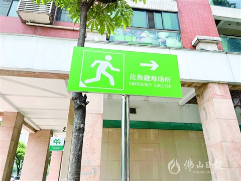 在禪城街頭,隨處可見每相隔100米的地方就有一個(gè)應(yīng)急避難場所指引牌。/佛山日報(bào)記者陳心如攝