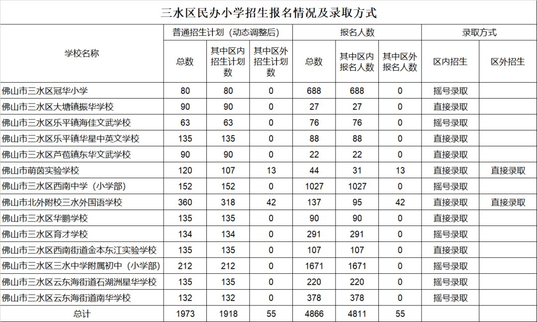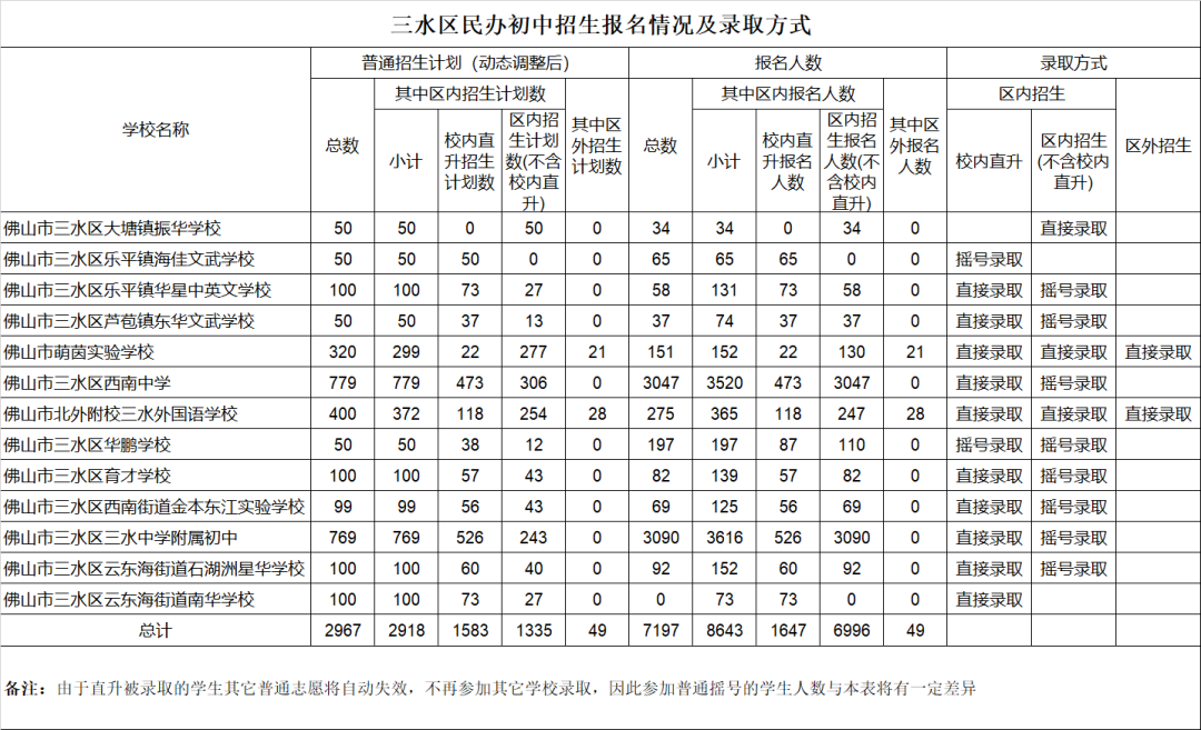 初中方面,共有9所初中(海佳文武學校、東華文武學校、西南中學、育才學校、三水附中、星華學校、東江實驗學校、華星中英文學校、華鵬學校)需進行電腦隨機搖號錄取。其中,三水中學附屬初中共招769人,報名人數達3090人,除校內直升報名人數,該校報錄比接近13:1;三水西南學校共779人,報名人數達3047人,除校內直升報名人數,該校報錄比接近10:1。
