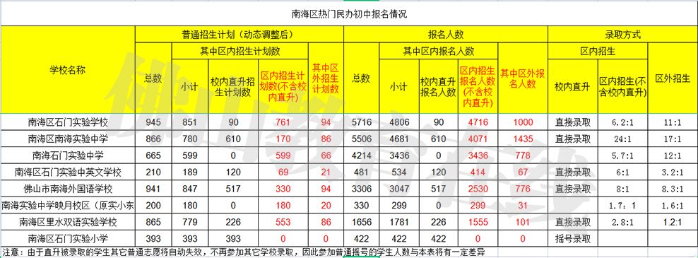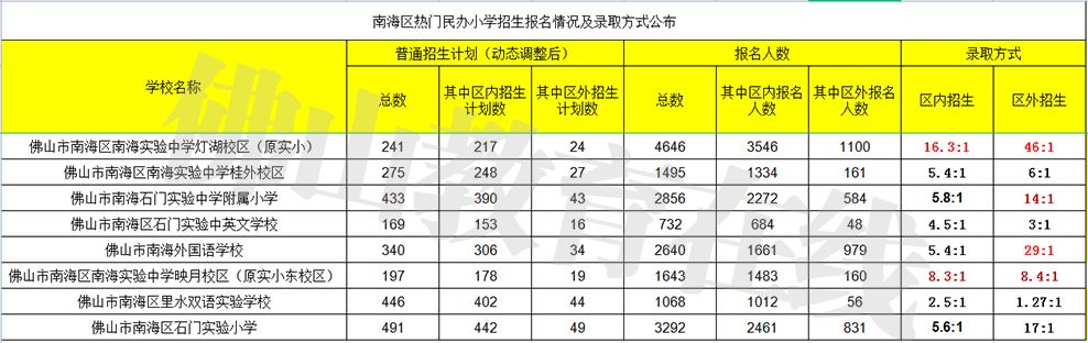 在民辦小學招生方面,受到校內直升政策等因素影響,今年部分一貫制下的民辦小學熱度比往年有所升溫。其中,小學方面,原南海實驗小學現成為南海實驗中學的小學部,以“南實燈湖校區(qū)(原實?。泵终猩?,區(qū)內報錄比由去年的7:1增加到16:1,區(qū)外報錄比由19:1增加到46:1,搖中難度大大增加。