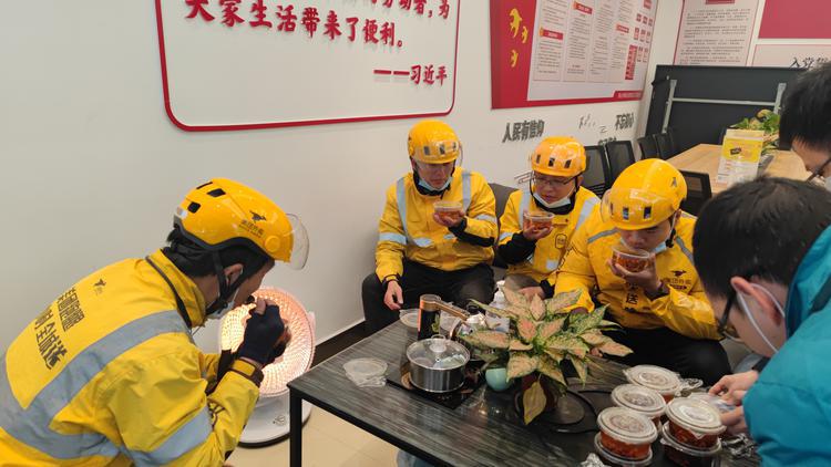 在朝安路的快遞小哥紅色驛站,快遞小哥在電暖器旁喝著紅糖姜水。/佛山日?qǐng)?bào)記者郭美歡攝