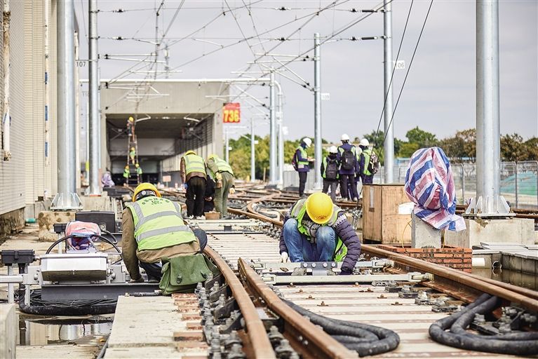 “地面建筑基本是去年一年建成的,我們每周對照進(jìn)度開展工作,從上到下嚴(yán)格把關(guān)每個環(huán)節(jié),合理配置資源。”現(xiàn)場生產(chǎn)經(jīng)理馬得翼介紹,施工高峰期有400多人,目前現(xiàn)場施工人員有330多人,主要為土建工人和負(fù)責(zé)機(jī)電、鋪軌等站后工程的工人。目前,停車場的土建進(jìn)度已完成95%以上。