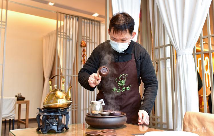 小林在為食客沏茶。/佛山日?qǐng)?bào)記者陳意威攝