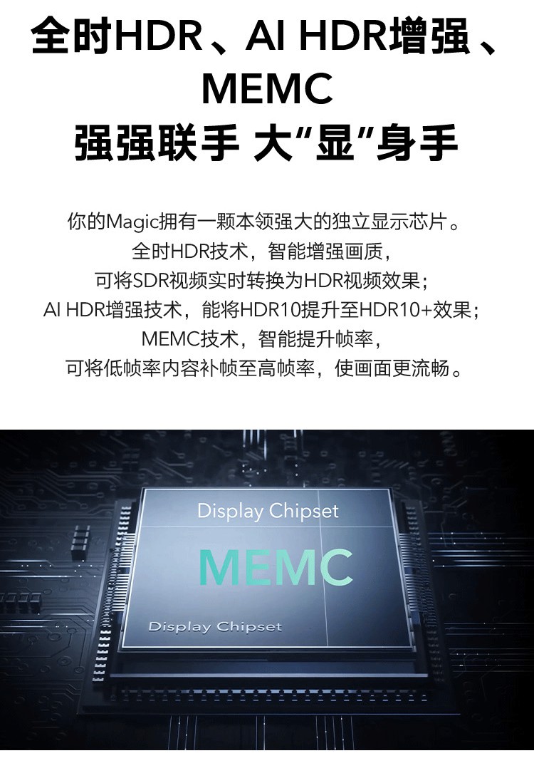 獨(dú)立的MEMC顯示芯片,AI HDR增強(qiáng),
