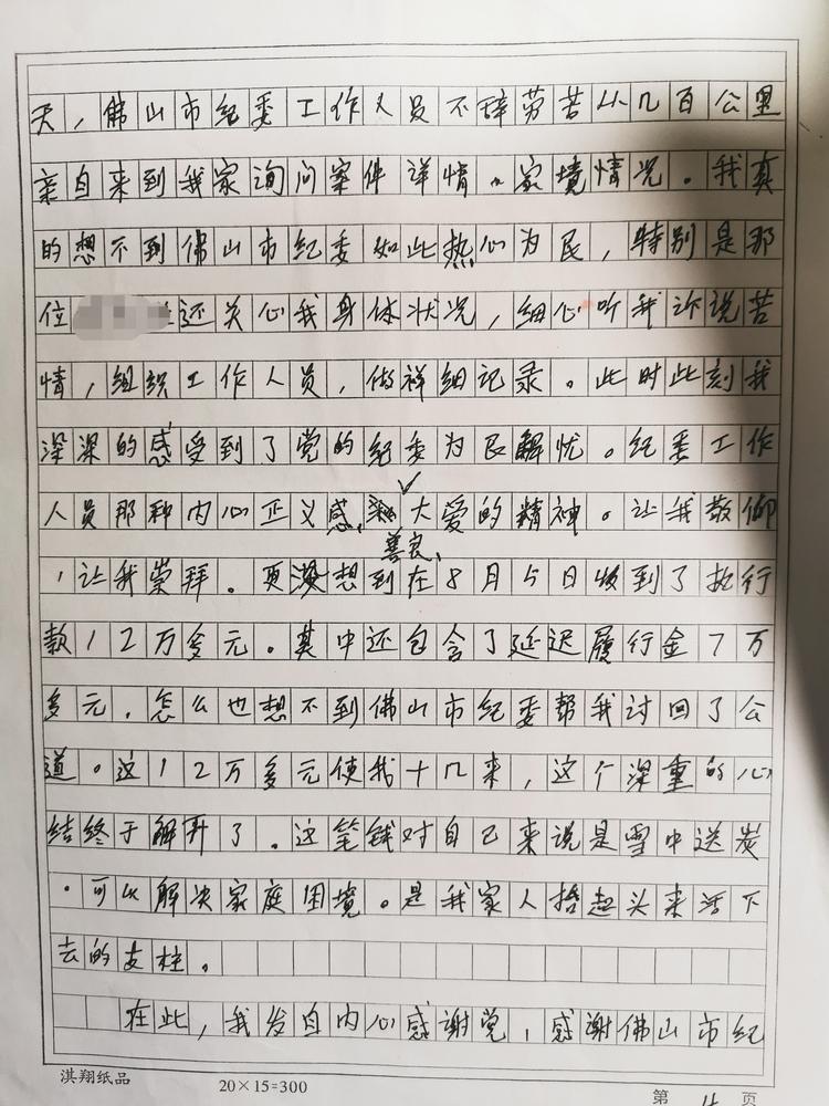 “銀行短信發(fā)到手機上后,我父親還是不敢相信,讓我反復(fù)查實,不僅一分都沒少,還多了延遲履行金?!倍际盏娇铐椇蠹拥卣f,“沒想到是佛山市紀(jì)委監(jiān)委幫我們追回來的,隨著心結(jié)打開,為表達(dá)感激之情,父親決定代表我們一家人親筆寫了這封感謝信。”