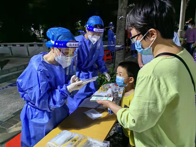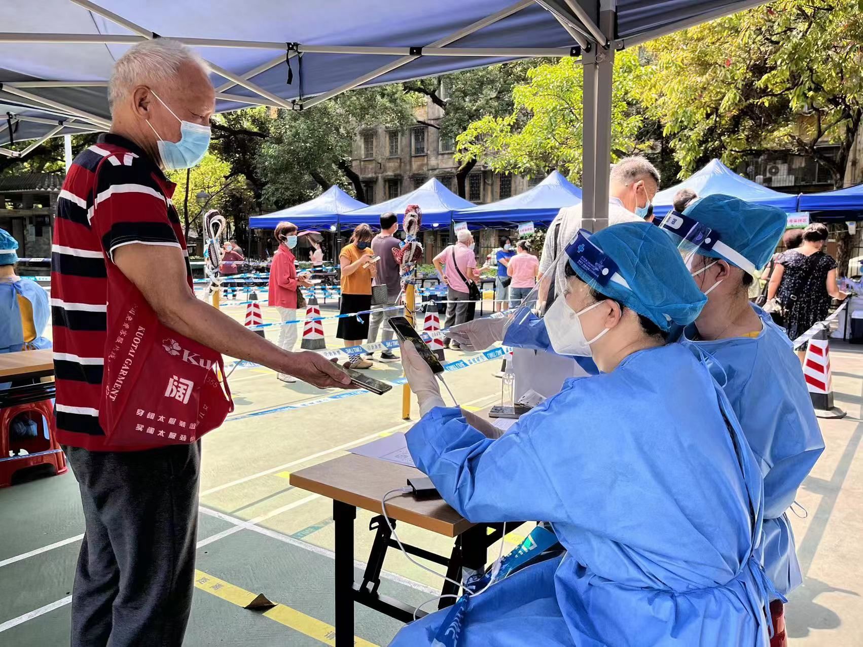 禪城區(qū)祖廟街道退役軍人服務(wù)站工作人員在朝安東社區(qū)尚輝苑協(xié)助開展全員核酸檢測(cè)工作。