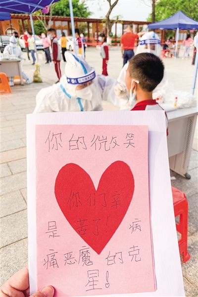 對(duì)于醫(yī)護(hù)人員和志愿者的辛勤付出,三個(gè)鎮(zhèn)的市民通過不同的方式表示感謝。在樂平鎮(zhèn)范湖小學(xué)核酸檢測(cè)采樣點(diǎn),學(xué)生們用自己做的花朵和賀卡向辛勞的醫(yī)護(hù)人員表達(dá)謝意;在蘆苞鎮(zhèn)科藝普核酸檢測(cè)采樣點(diǎn),一名女士留下5箱水就匆忙離開;在大塘新城核心區(qū)大塘廣場(chǎng)核酸檢測(cè)采樣點(diǎn),有茶飲店老板騎電動(dòng)車為志愿者送上親手制作的檸檬茶……一個(gè)個(gè)暖心的舉措溫暖著現(xiàn)場(chǎng)的工作人員。
