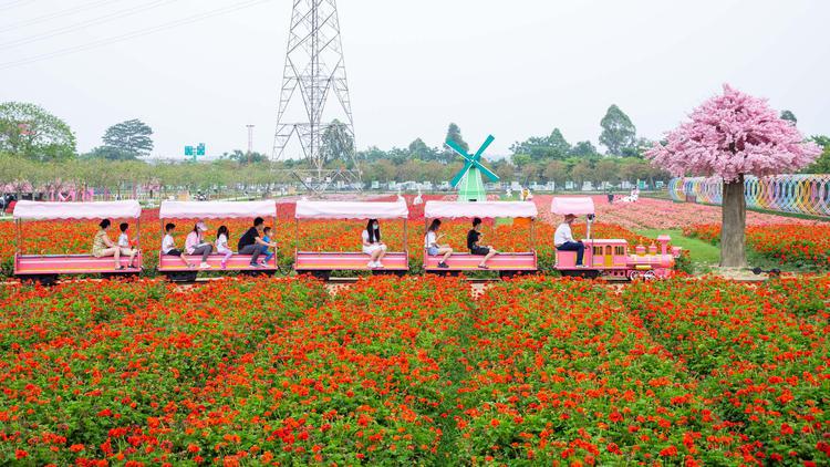 游客乘坐小火車穿過高明盈香生態(tài)園花海。/佛山日報(bào)記者洪海攝