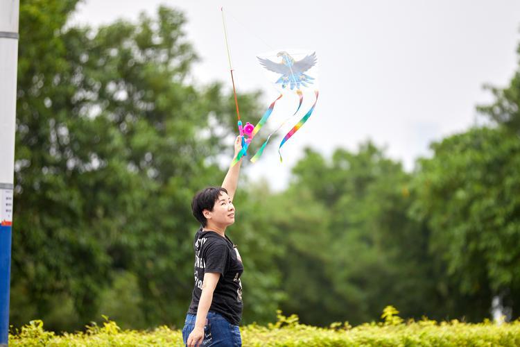 在濱河景觀帶放風(fēng)箏的游客。/佛山日報(bào)記者呂潤致攝